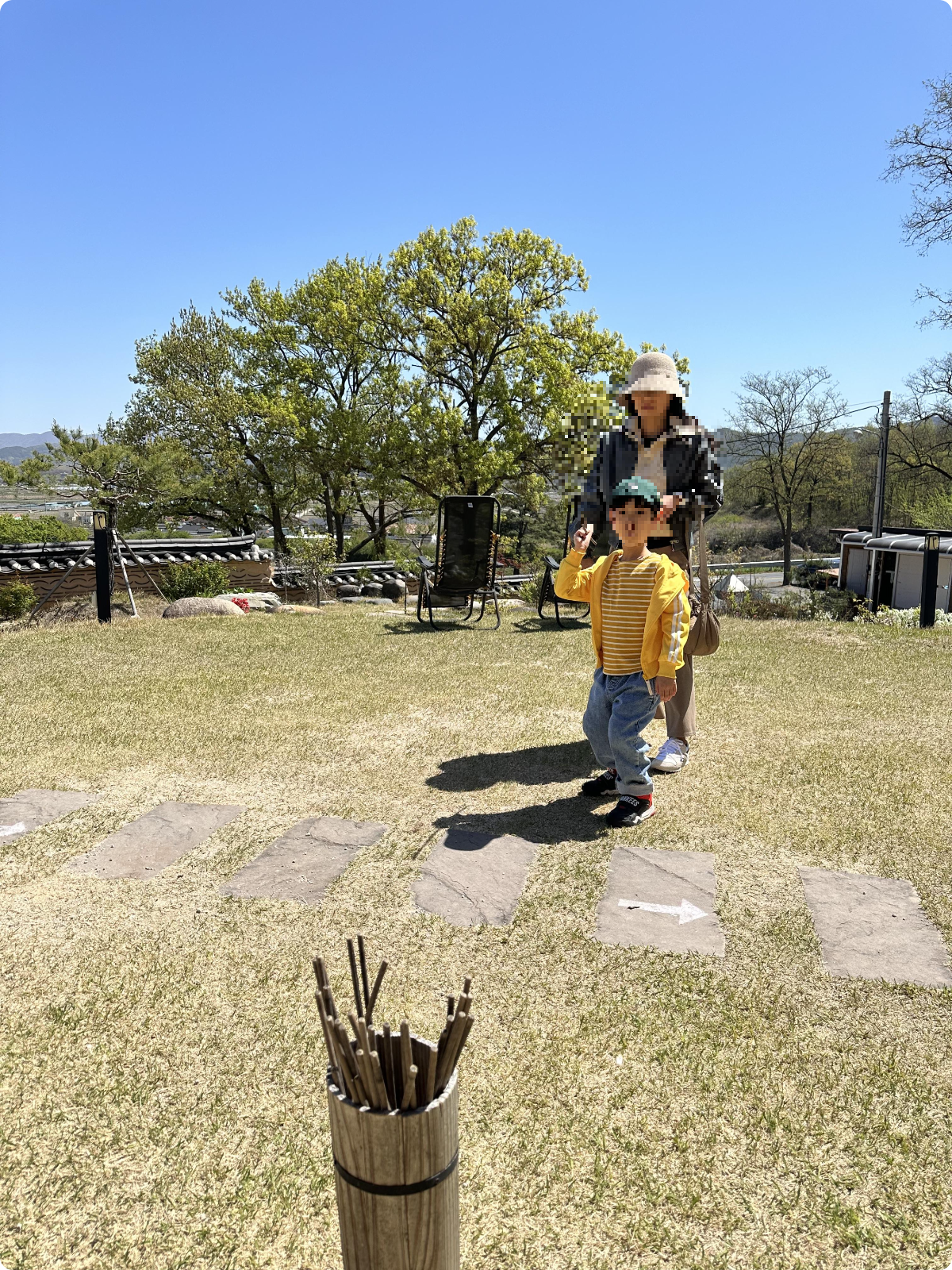 아이와 함께 투호놀이를 하다 보니 시간 가는 줄 몰랐고, 이외에도 윷놀이 판도 있었으며, 제기차기 등과 같은 한옥펜션에 어울리는 전통놀이들이 있어서 가족과 함께 전통놀이 즐겨 보시면 좋을 듯해요.