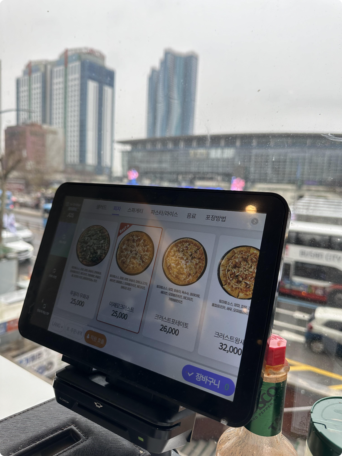 이재모 피자집에 메뉴는 이렇게 키오스크로 테이블마다 주문 방식으로 되어 있습니다.